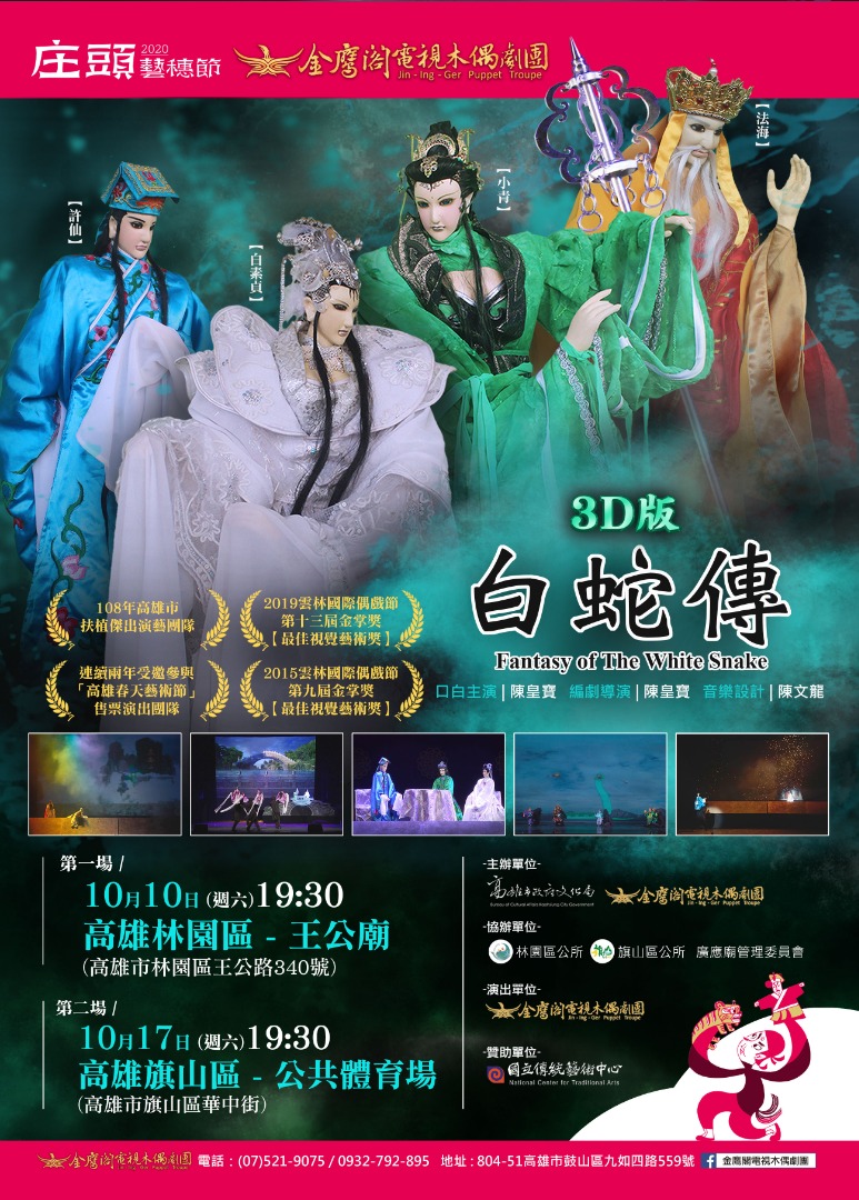 金鷹閣電視木偶劇團《3D版-白蛇傳》,曾以《雷峰塔》一劇,獲選參與高雄市文化局主辦『2010高 雄春天藝術節』壓軸售票演出,與高雄市國樂團跨界合作,獲得各界推薦與青睞。