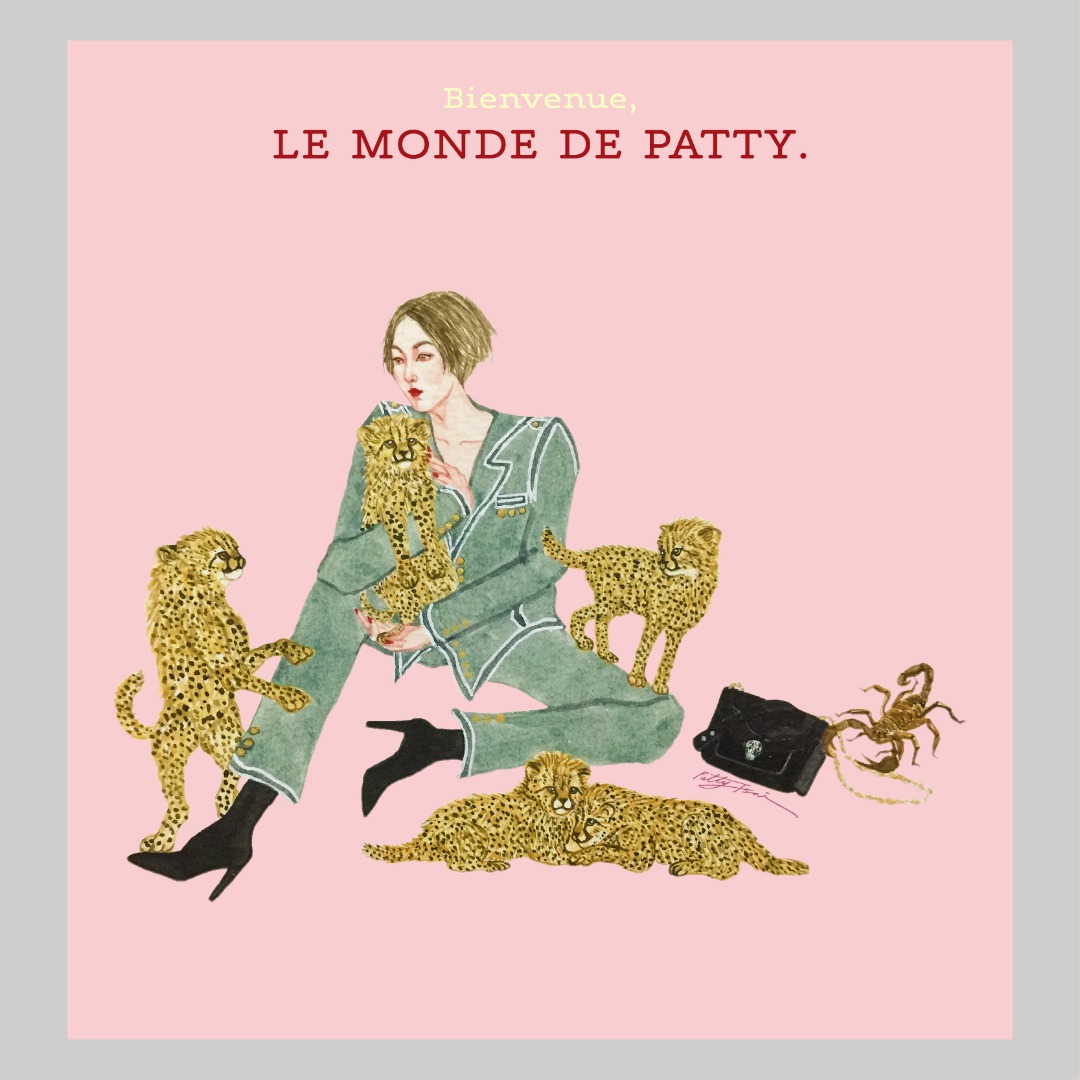 她將最愛的獵豹擬人,繪製自己與獵豹的腦補日常。半寫實、半主觀的表現手法,「摩登化」了尋常可見的豹紋,並結合時尚插畫之元素,消融過剩細節,呈現獵豹的各種表情姿態。超現實的情節,滿足了愛做白日夢的自己。不論是率性的短髮女王還是反差萌的「猛獸毒物」,都在《 LE MONDE DE PATTY 》。精選的瓷土陶作,將獵豹與蠍子立體化,製成日常生活器皿及居家裝飾,大量的原色留白,彰顯了獵豹身上炫目的黑色圓點花紋。