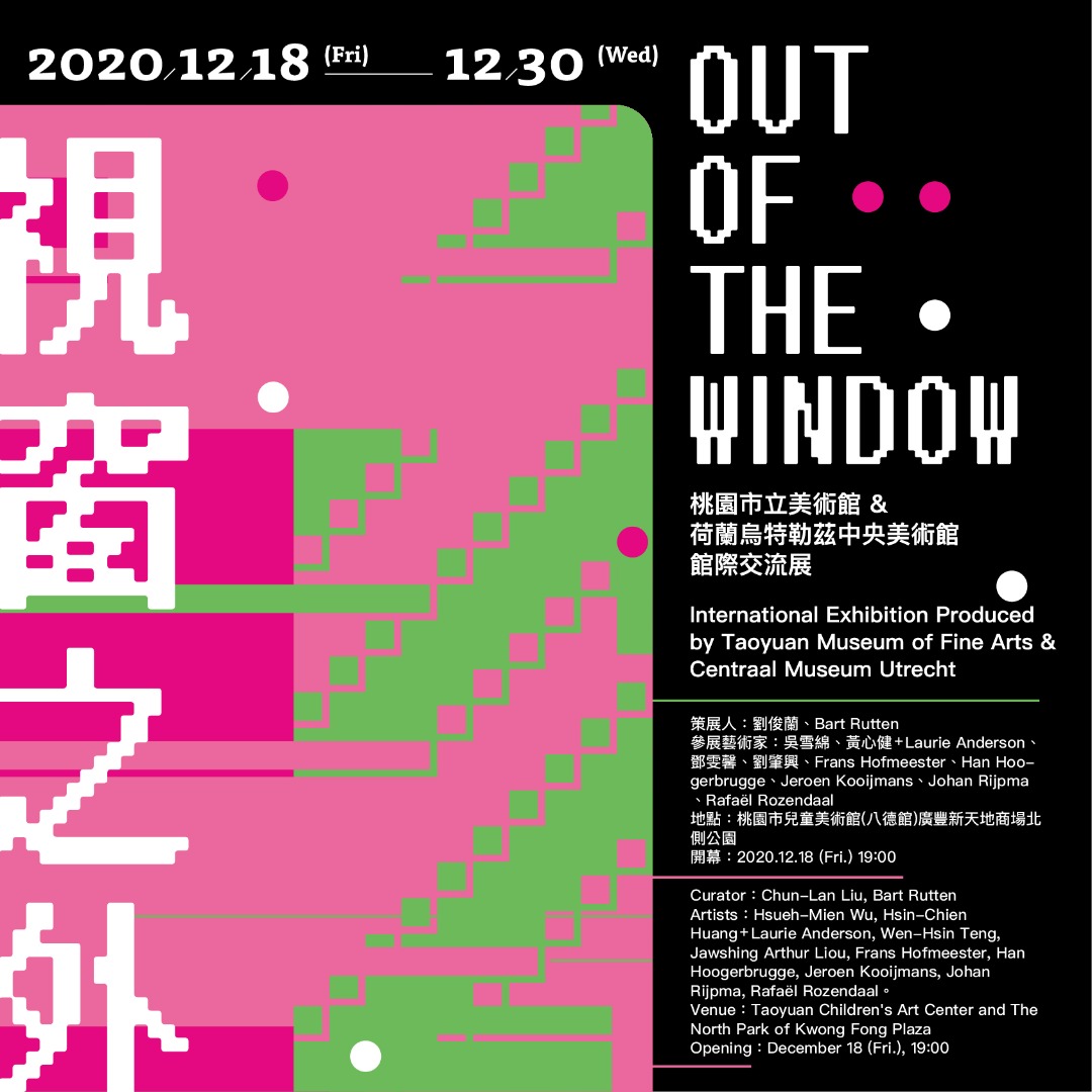 桃園市立美術館的主體建築仍在興建,目前暫以八德區兒童美術館(廣豐大樓五、六樓)為基地。在歡慶成立三週年之際,本館與荷蘭烏特勒茲市的中央美術館跨國合作,以「視窗之外」為題舉辦特展。展覽突破現有空間的侷限,從成排的落地窗延伸至外牆,藉大型投映裝置進行露天展演,遠眺窗格之外,藝術所可能帶來的遼闊視野,以及由內而外所可能翻轉的未來。