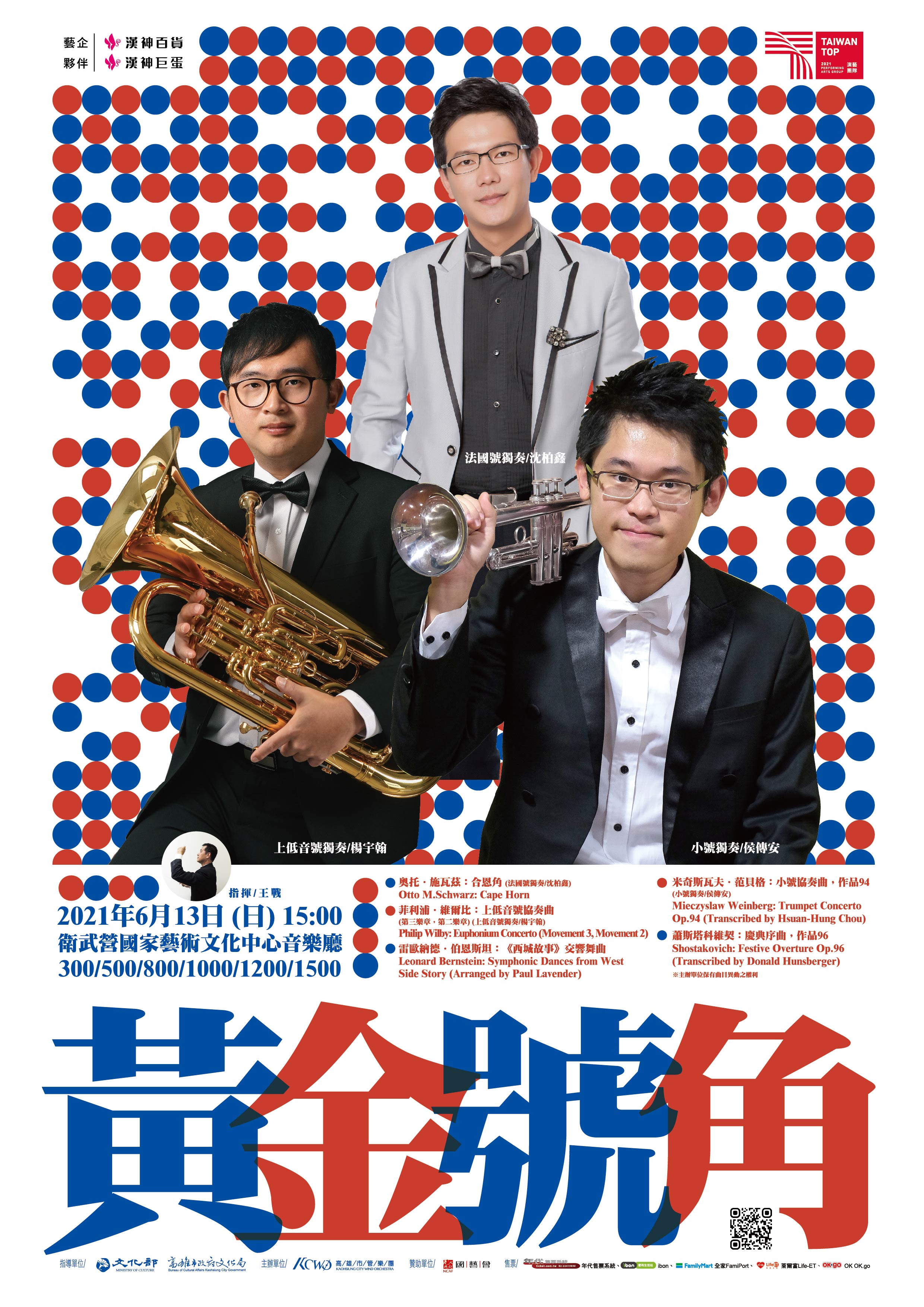 高雄市管樂團自2012年成立以來,已經舉辦超過百場的音樂會,樂團基於推廣精緻管樂藝術的理念,這些年來也不斷邀請國內外優秀的音樂家與樂團合作演出,而本場音樂會我們特別邀請到曾獲得多項國際大獎的小號演奏家侯傳安,以及去年剛獲得韓國濟州島國際銅管大賽上低音號組首獎的楊宇翰,加上活躍於南台灣管樂界的法國號演奏家沈柏鑫,三位獨奏者將分別與樂團合作演出協奏曲,另外還有非常經典的《慶典序曲》與《西城故事》交響舞曲,我們將帶給大家一場宛如節慶般的音樂饗宴,並且讓各位觀眾從中深深感受到銅管樂器黃金般燦爛的音色與音樂魅力。