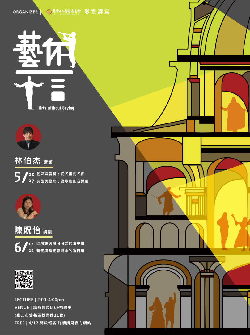 音樂是一首流動的詩,而繪畫拓展了藝術美麗的詩篇,一年一度由麗寶文化藝術基金會所主辦的彩雲講堂-生活與藝術系列講座,即將在五月份與各位觀眾見面,今年主題為「藝術不言」,特別邀請到國立台灣藝術大學美術學院院長陳貺怡,以及金革唱片音樂總監林伯杰,期待藉由二位重量級講師豐富的知識涵養,與長年在專業領域的成就典範,開啟閱聽大眾的文化視野,帶領大家探尋東西方近代藝術的脈絡融合與發展。想知道可可與巴洛克藝術為什麼要這樣稱呼嗎?想知道歌劇與音樂劇之間的差別嗎?邀請您一同參與2022彩雲講堂「藝術不言」系列講座!