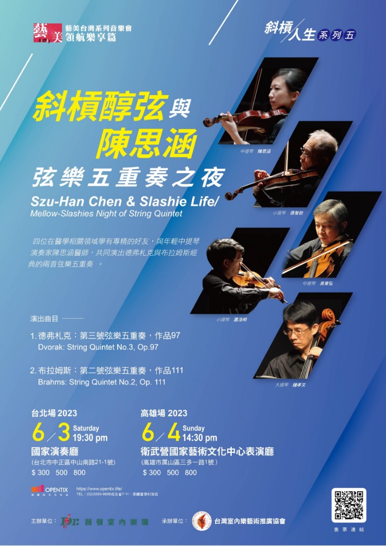 斜槓醇弦四重奏由四位醫聲室內樂團首席,同時在醫學相關領域學有專精的好友組成。在首場鋼琴五重奏演出後,接連演出系列二弦樂四重奏,系列三豎笛五重奏,系列四弦樂四重奏。本次系列五將邀請年輕的中提琴醫師音樂家陳思涵醫師共同演出布拉姆斯與德弗札克著名的兩首弦樂五重奏。