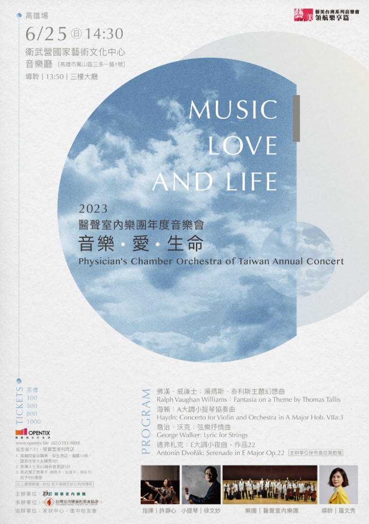 醫聲室內樂團匯聚來自台灣醫療界優秀的演奏家,成立至今三十多年,他們致力以音樂關懷社會。過去三年對抗新冠疫情,團員堅守崗位積極防疫之餘,仍秉持對音樂的熱愛,今年六月將為南部觀眾帶來一場音樂盛宴。這是一場關於「音樂」、「愛」、「生命」的音樂會,其概念呈現在曲目的安排:以佛漢.威廉士的「泰利斯幻想曲」開場,用多部弦樂重現文藝復興時期在教堂虔誠歌詠的共鳴;中場演出沃克的「抒情曲」,為紀念已故的親人而作;最後安排經典德弗札克「小夜曲」,一切回到音樂的初衷。本場音樂會並邀請小提琴家徐文妙醫師,共同演出海頓小提琴協奏曲。