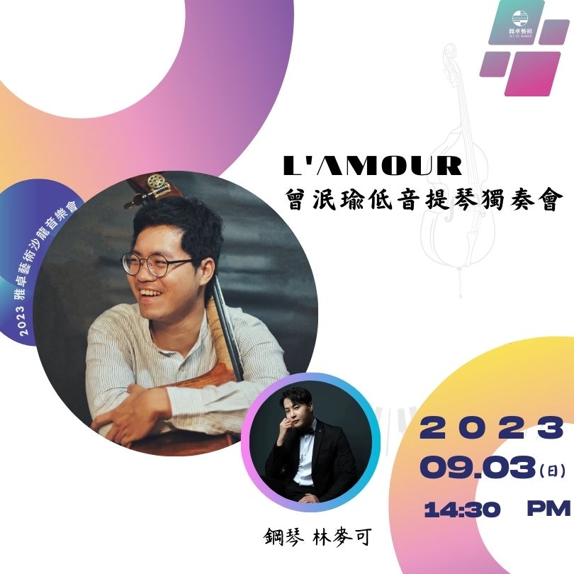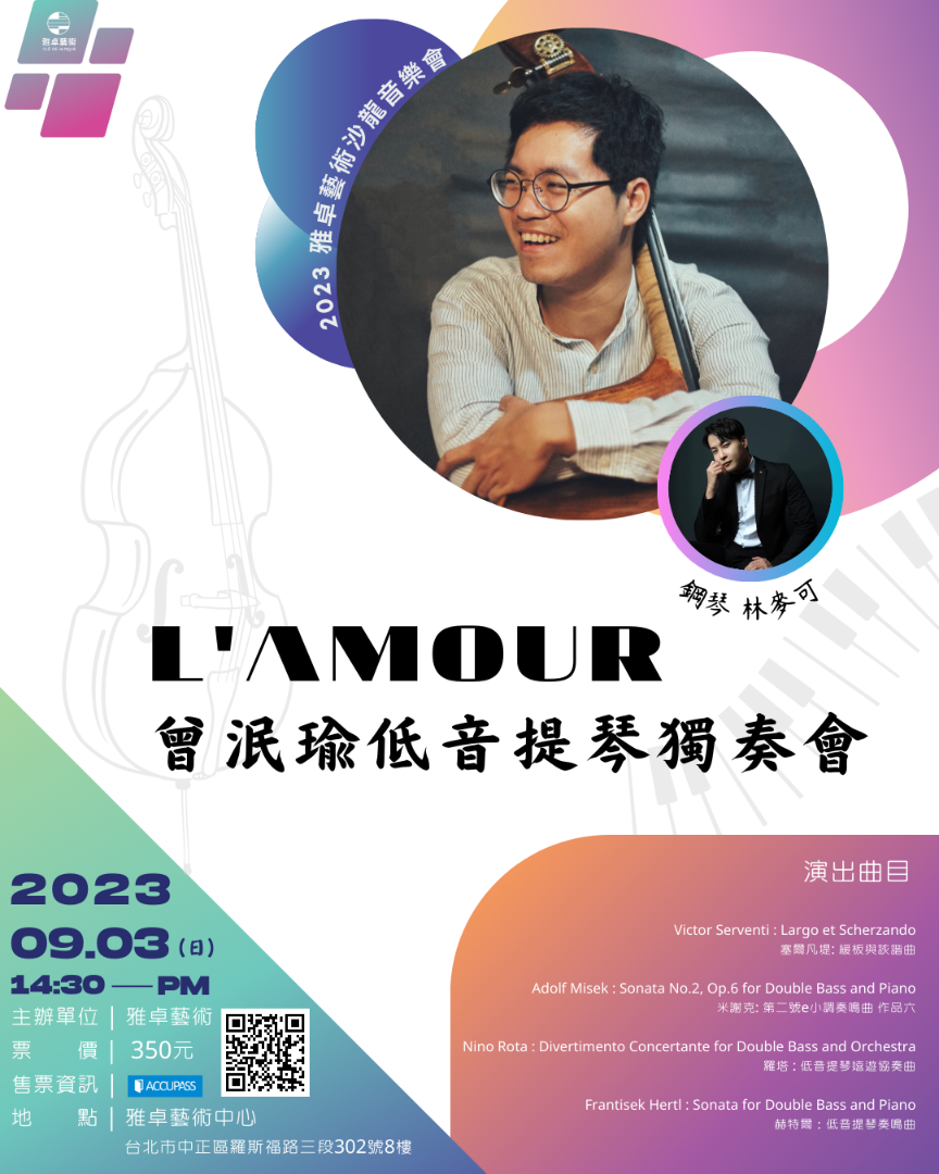 L'amour源自於法文,含義代表愛的意思。曾泯瑜留學期間師從法國低音提琴大師,目前擔任巴黎高等音樂院管弦樂團低音提琴首席,經常於歐洲各地音樂廳擔任獨奏與室內樂演出,本次音樂會將與鋼琴家林麥可演出四首當代低音提琴樂曲,期待帶給觀眾美妙的音樂饗宴。