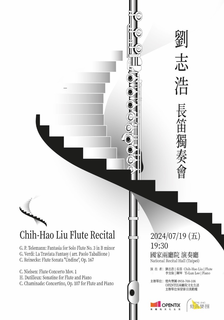 新生代長笛家劉志浩與鋼琴家李宜倫已攜手合作多年,除了在各項比賽獲獎無數,舞台上更是相得益彰,此次演出將從巴洛克時代著名的作曲家泰勒曼的《12首無伴奏長笛幻想曲》中第三號作品拉開續幕,旋律優美活潑,節奏對比強烈;膾炙人口的作品《茶花女》是古典時期威爾第所譜曲,並於1853年搬上歌劇院時將標題改成"La Traviata"也就是誤入歧途的女人,藉由扣人心弦的旋律,將觀眾引領進這一幕幕的悲劇故事;浪漫樂派時期的卡爾.藍乃克是德國的音樂家,其作品水妖Undine是描述一位活在水中的美麗精靈,與人間男子Huldrand的愛情故事,全曲分四個樂章,從渴望之情,進而以快速的十六分音符形容水花四濺的熱情,第三樂章的恬靜行板,使長笛與鋼琴間宛如情人般的對話,到終曲以激動急板掀起水妖的復仇;丹麥作曲家卡爾.尼爾森的長笛協奏曲處處可見幽默的語法,樂段間常具有令人意料之外的個性變化,處處充滿驚奇,聲部間時而緊密對話,時而跳脫現實;亨利.杜悌尤為20世紀出色的法國作曲家,此長笛小奏鳴曲運用許多連續平行音程,不合諧音程及轉調模糊手法,對吹奏者來說是一個極大的挑戰,節目尾聲由膾炙人口的法國女作曲家夏米納德,寫給她心愛的人的長笛協奏曲,為音樂會劃下完美的句點。