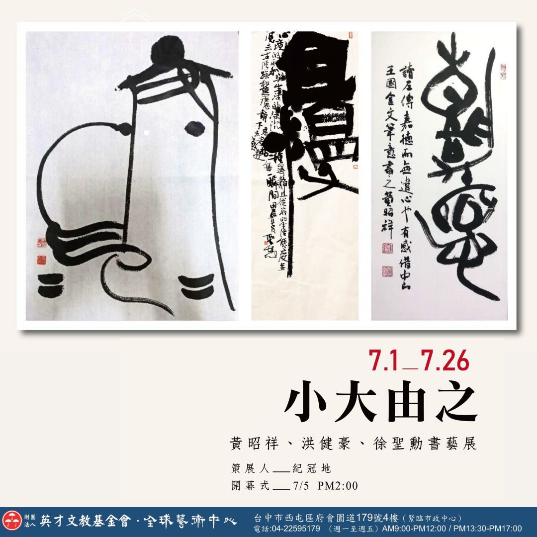 小大由之—黃昭祥、洪健豪、徐聖勳書藝展,訂於2024年7月1日至7月26日(週一至週五) AM9:00~PM12:00/PM13:30-PM17:00在財團法人英才文教基金會全球藝術中心(台中市西屯區府會園道179號4樓)展出,開幕式訂於7月5日下午2:00,歡迎各界蒞臨欣賞。
