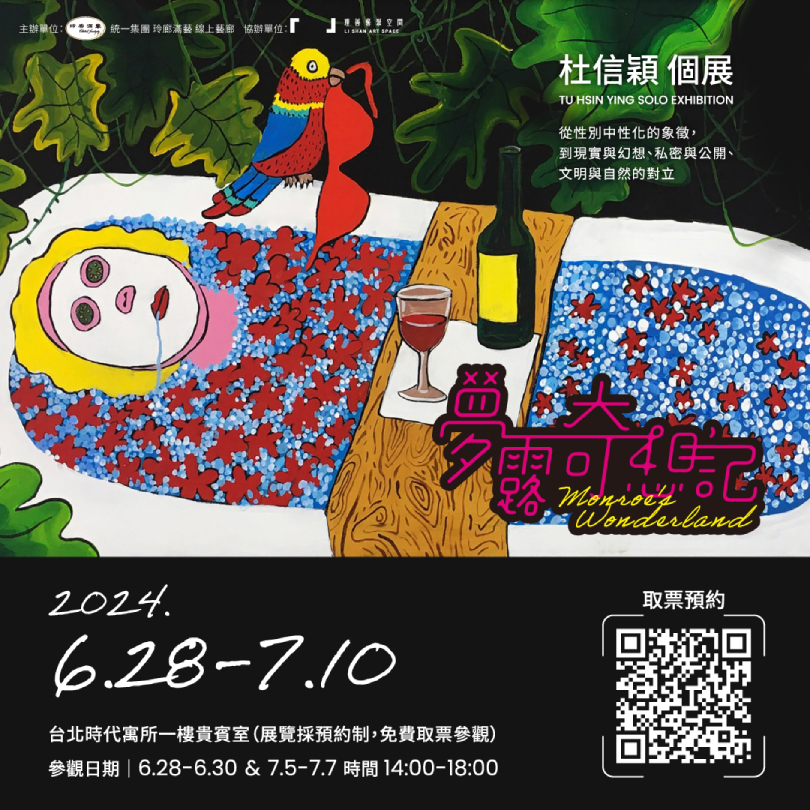 在「夢露奇想記」展覽中,藝術家杜信穎以安迪沃荷的經典版畫形象——瑪麗蓮夢露作為創作核心,通過多重寓意和情境營造,引導觀眾進入一個充滿象徵意義的奇幻世界。杜信穎的作品反映了當代生活的扁平卡通化特徵,其創作超越了對夢露形象的簡單再現,而是深入探討現代社會生活中的矛盾、衝突和人類情感的複雜性。