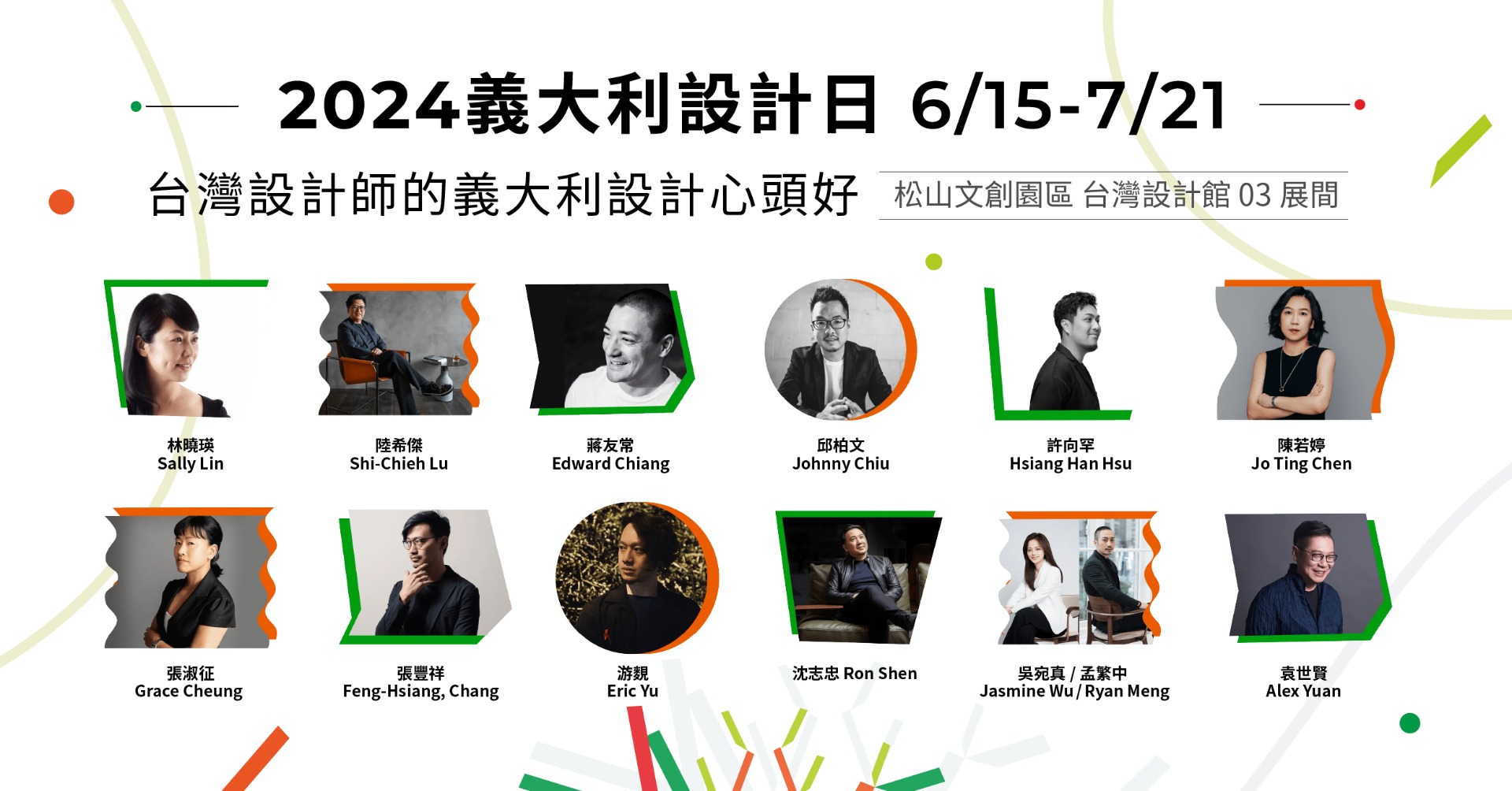 2024全球義大利設計日(Italian Design Day)以「台灣設計師的義大利設計心頭好」(CONNECTING CHOICES Taiwanese Designers Meet Italian Design)為題,台灣展覽策展人、義大利建築師及設計師費德麗卡‧薩拉(Federica Sala)邀請12組台灣知名建築師、設計師作為引路人,包括吳宛真/孟繁中、沈志忠、林曉瑛、邱柏文、袁世賢、張淑征、張豐祥、許向罕、陳若婷、陸希傑、游麲、蔣友常(依姓氏筆劃排列)、選出超過30件讓設計人念念不忘,甚至是被觸發、被啟迪的義大利設計,分享給喜好設計工藝美學的台灣民眾一起深度認識義大利設計之美。