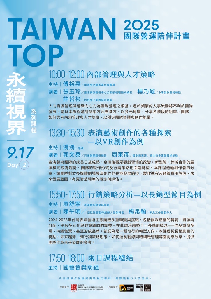 國藝會關照表演藝術團隊營運發展,每年以「演藝團隊年度獎助專案」為主,規劃團隊經營課程。今年度協同表演藝術聯盟(表盟),於9月16日以及17日辦理為期二天的「Taiwan Top 2025團隊經營課」,歡迎藝文團隊報名參加。